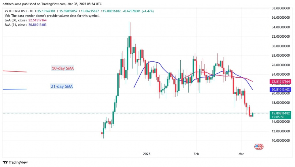 Hyperliquid (HYPE) has fallen below the moving average lines. The downtrend has weakened after falling as low as $14.65. HYPE rose to a high of $35.17 on December 21, 2024, but was pushed back twice.