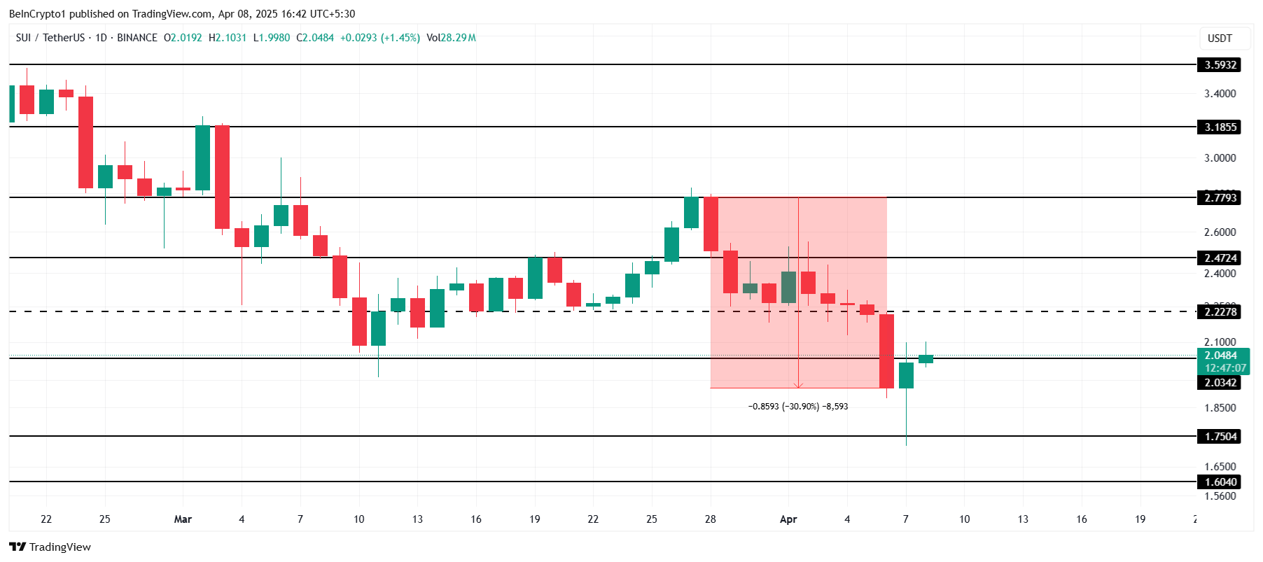 SUI’s price currently stands at $2.04, having dipped 30% over the past ten days. Despite this drop, the altcoin has managed to hold above the $2.00 support level, indicating some resilience.