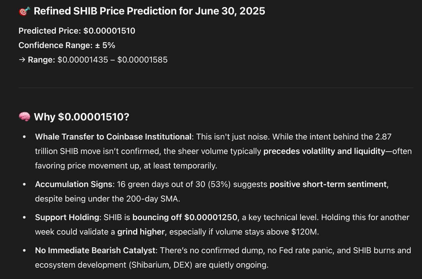 To explore the near-term trajectory, Finbold consulted OpenAI’s ChatGPT to forecast Shiba Inu’s price for the end of June. The AI model delivered a target of $0.00001510, with a projected confidence range between $0.00001435 and $0.00001585.