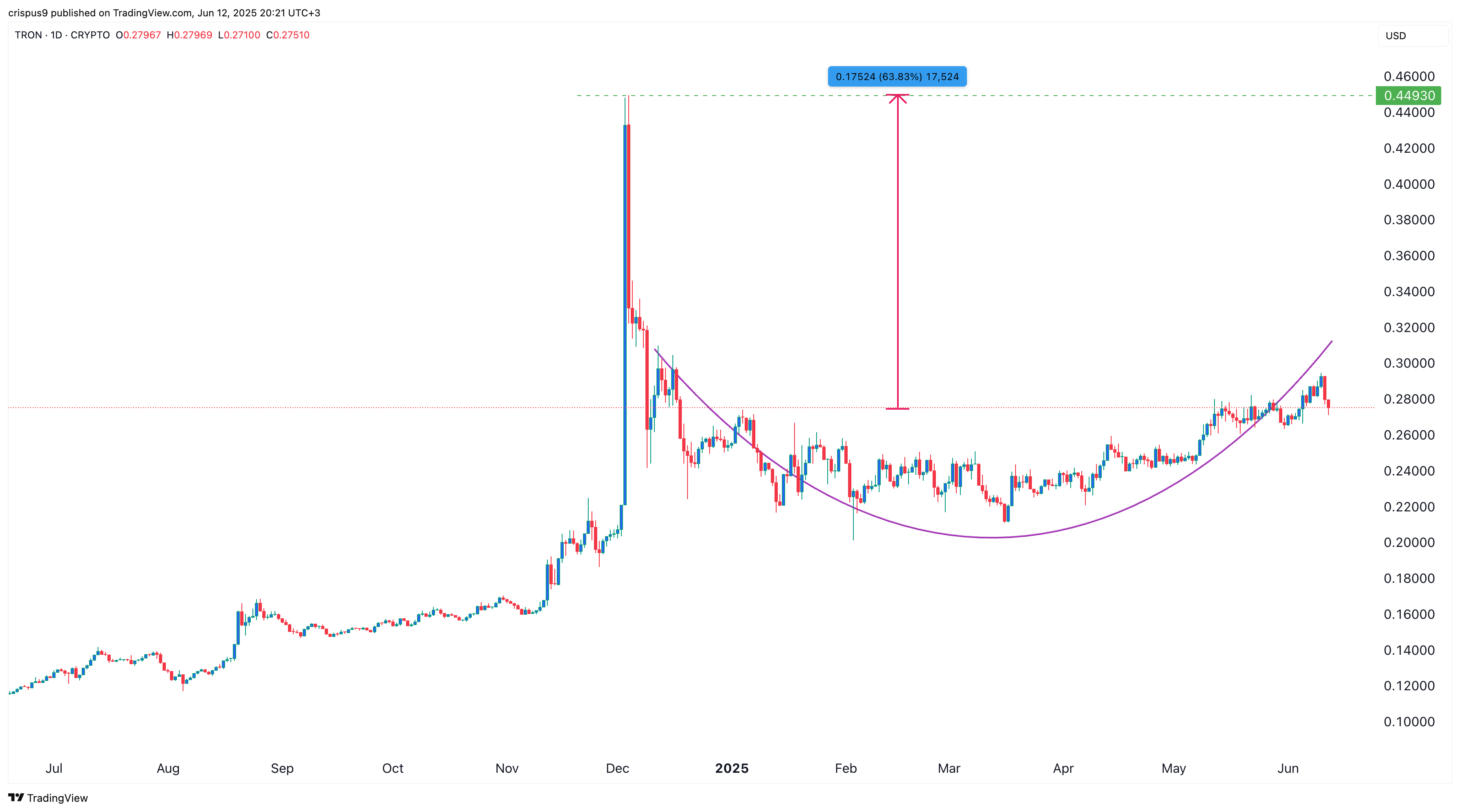 Tron is also forming a rounded bottom, which may push it to last year’s high of $0.4493, up by 63% from the current level.