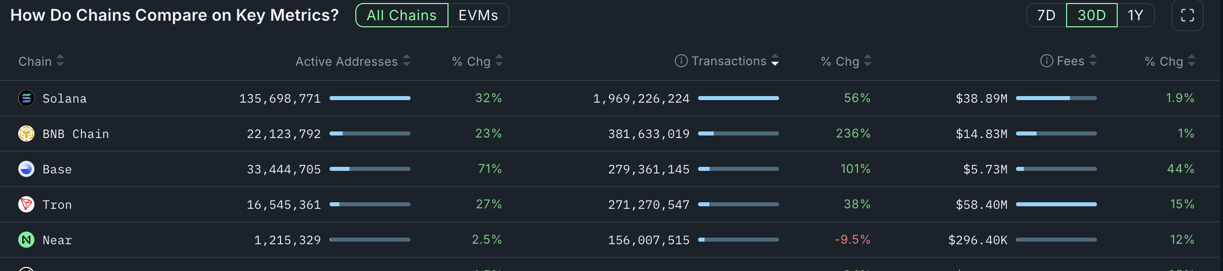 Solana is another top cryptocurrency to buy because of its strong fundamentals. It has the most active transactions, with the 30-day figure jumping by 56% to 1.92 billion. These transactions are more than those of other chains, combined.