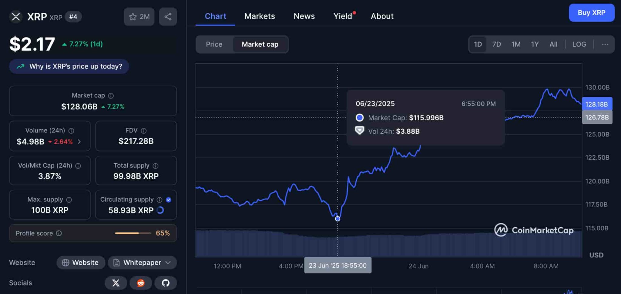 XRP price posted a sharp and technically significant recovery on June 23, climbing from an intraday low of $1.96 to a session high of $2.24, before settling around $2.17 at the time of writing on June 24.