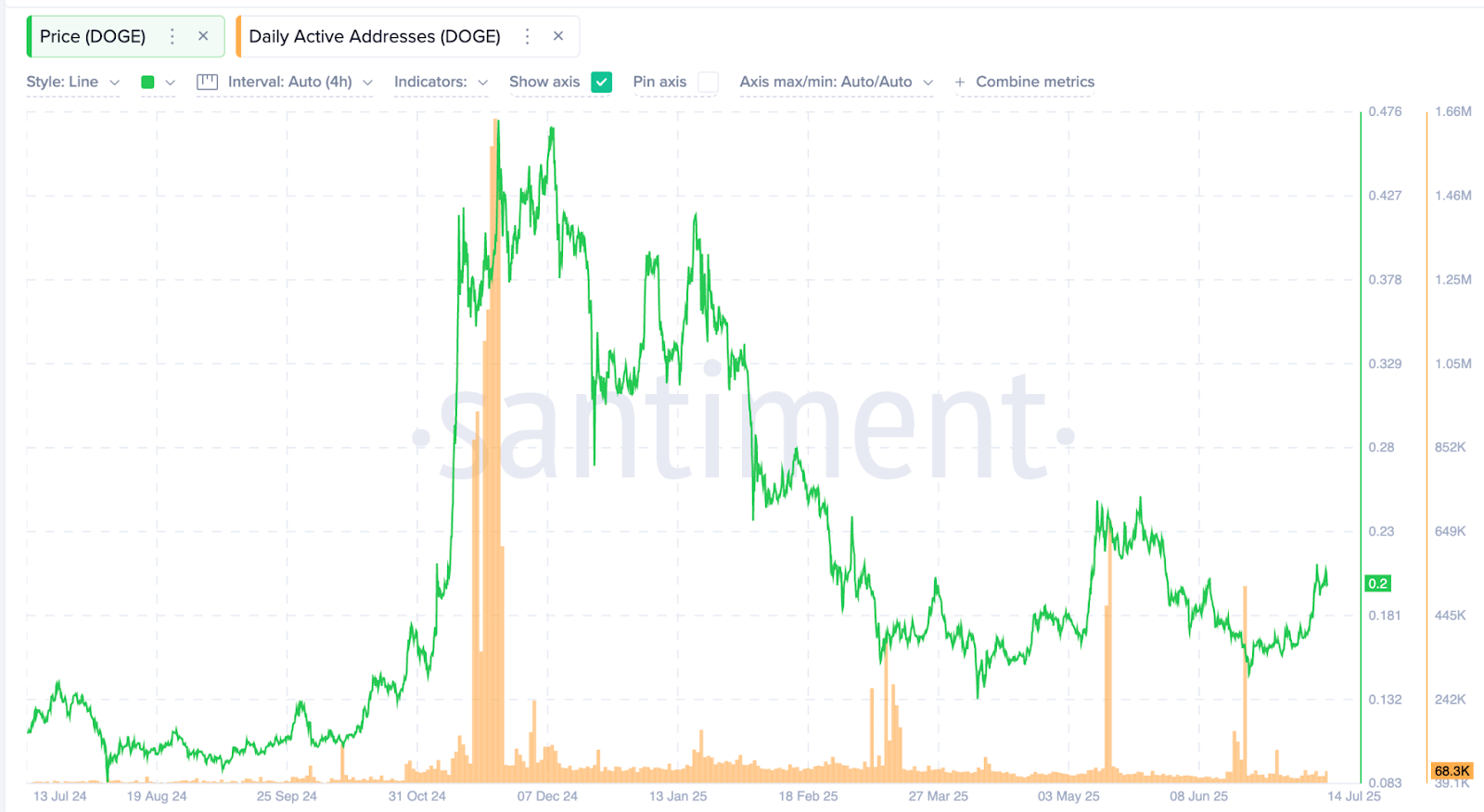 One key reason for the recent Dogecoin price action is the rise in network usage. Daily active addresses, which track how many wallets are sending or receiving Dogecoin, show renewed activity since late June.