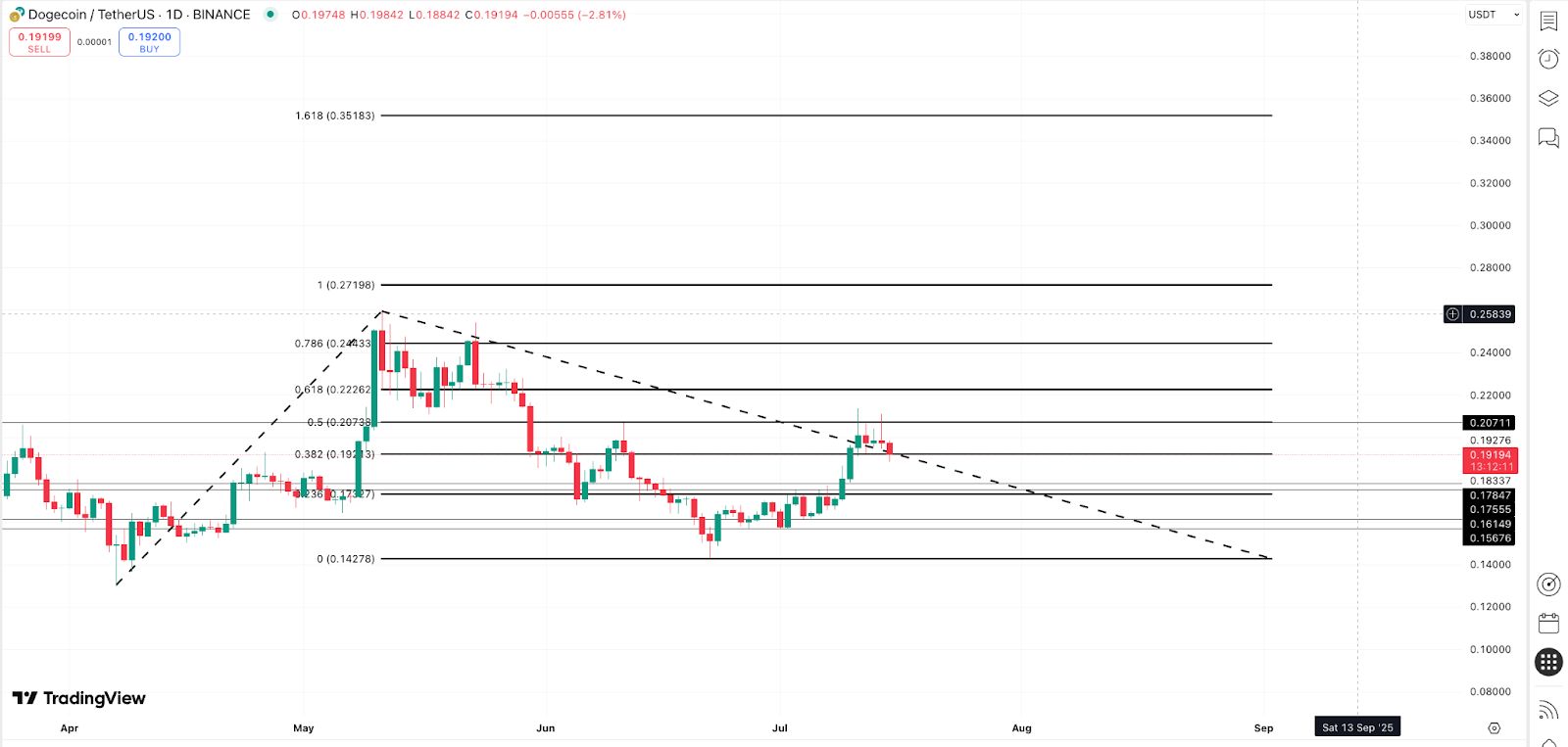 Right now, Dogecoin price is hovering around $0.19, sitting on the 0.382 Fibonacci level. If it breaks through $0.207, it may clear the downtrend line (marked by a dotted slope) and head toward $0.258 and above.
