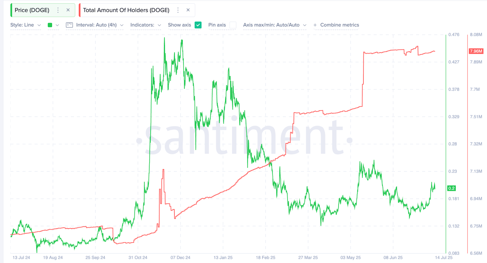 Dogecoin isn’t just being used; more people are holding it long-term. According to Santiment data, the total number of holders has now hit 7.96 million. That’s the highest it’s been since January 2025.