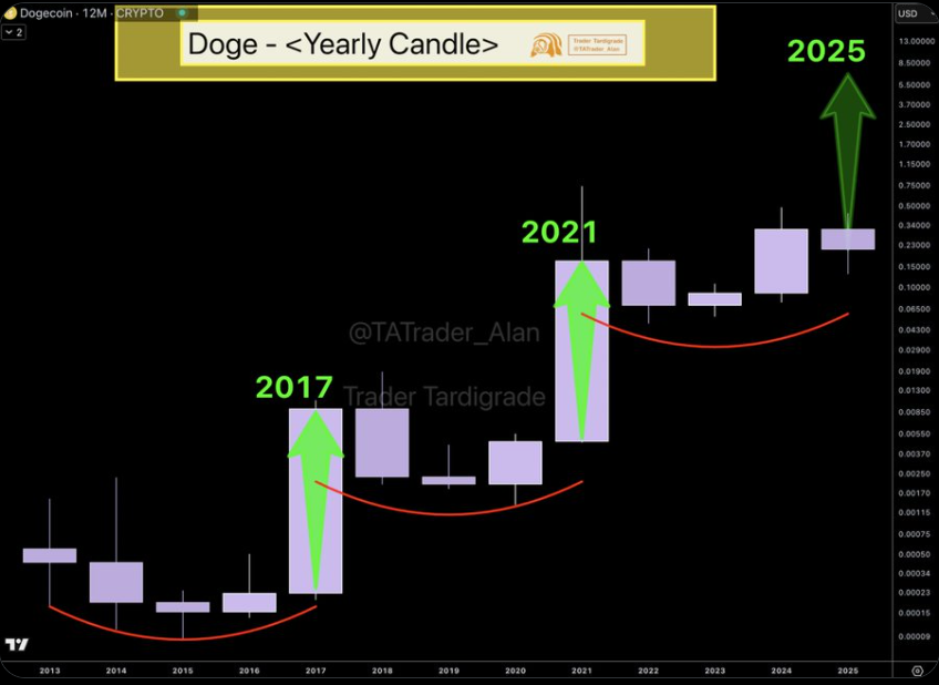Meanwhile, according to Trader Tardigrade, Dogecoin price can break out in 2025 because of the annual candle structure.