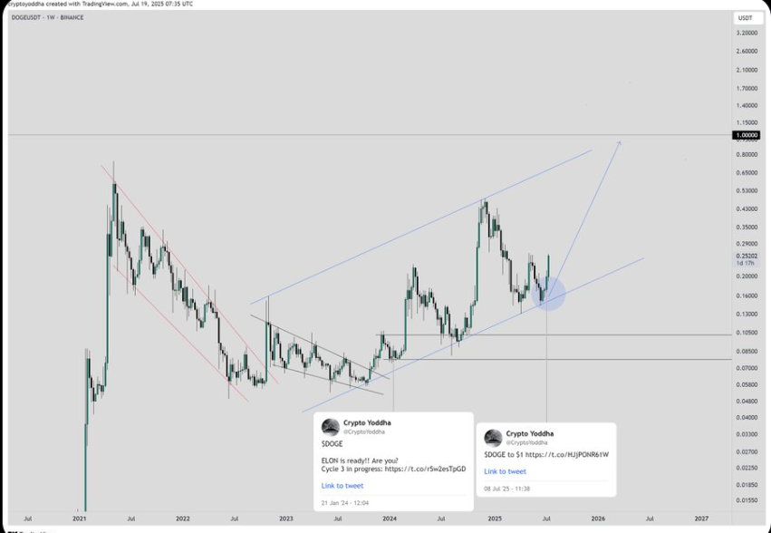 More so, Crypto Yoddha noted that the current trend may support a price expansion toward $1, provided Dogecoin maintains its upward momentum and trendline structure.