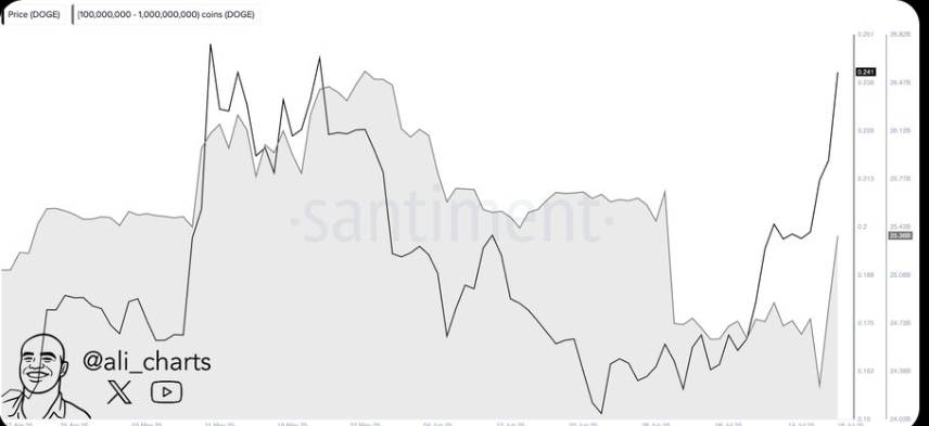 Consequently, this whale accumulation came with the increase of Dogecoin price to over $0.24. This indicated a possible correlation between accumulation and bullish trends in the market.