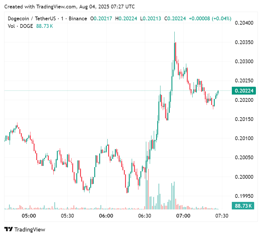 At press time, DOGE has jumped 3.15%. It is currently trading hands at $0.20 in the past 24 hours. Its market cap stands at $30.3 billion, after a 3.14% increase.