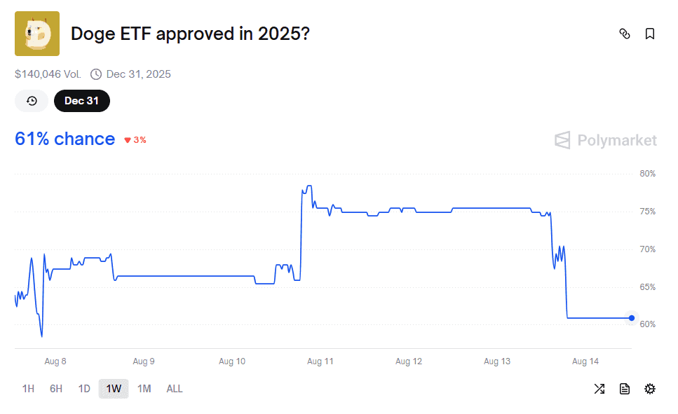 The potential approval of the first spot DOGE ETF in the USA is expected to have a positive impact on the price, and one can hypothesize that this is what the whales are waiting for. According to Polymarket, the odds for a green light before the end of 2025 stand at 61% which, in fact, marks a serious decline from the 79% witnessed on August 10.