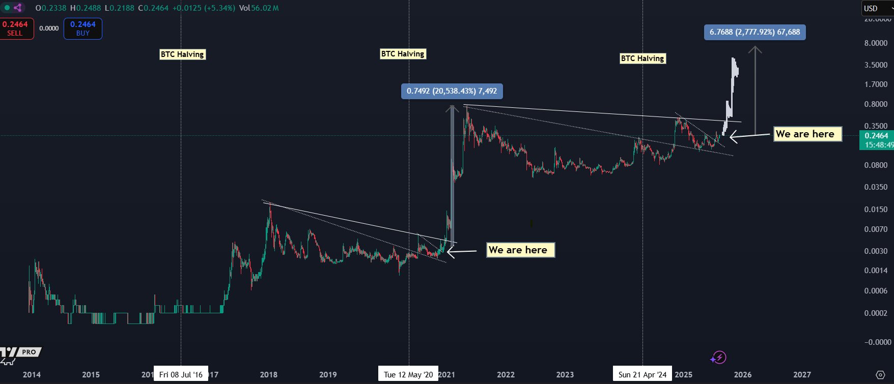 “DOGE/BTC chart looks like it’s ready to make the same type of move we saw in January of 2021. Zero doubt in my mind it’s only a matter of time before Dogecoin treasury companies are buying billions of dollars worth of the king of the memes. $6.9420 for one DOGE is a magnet.”