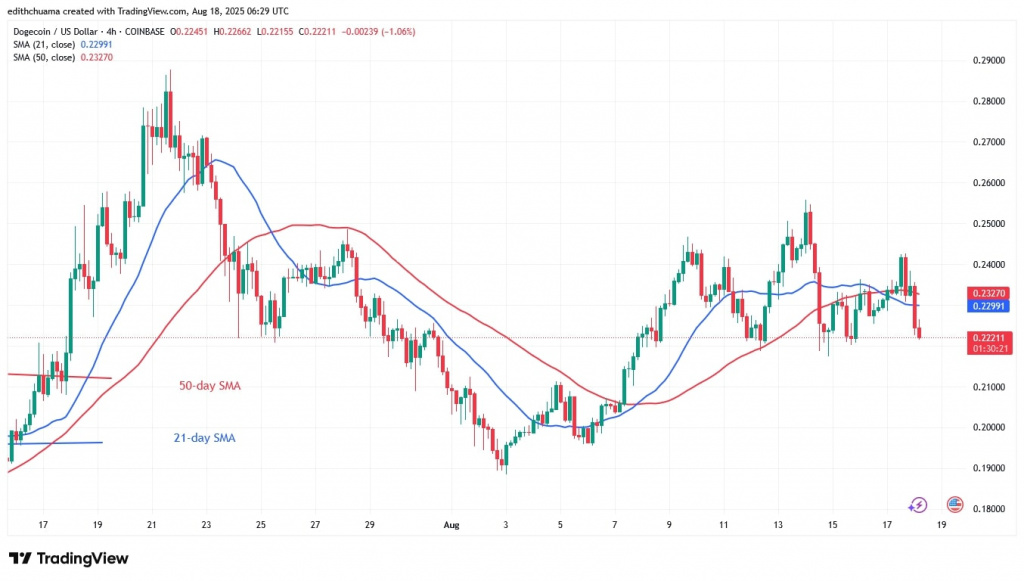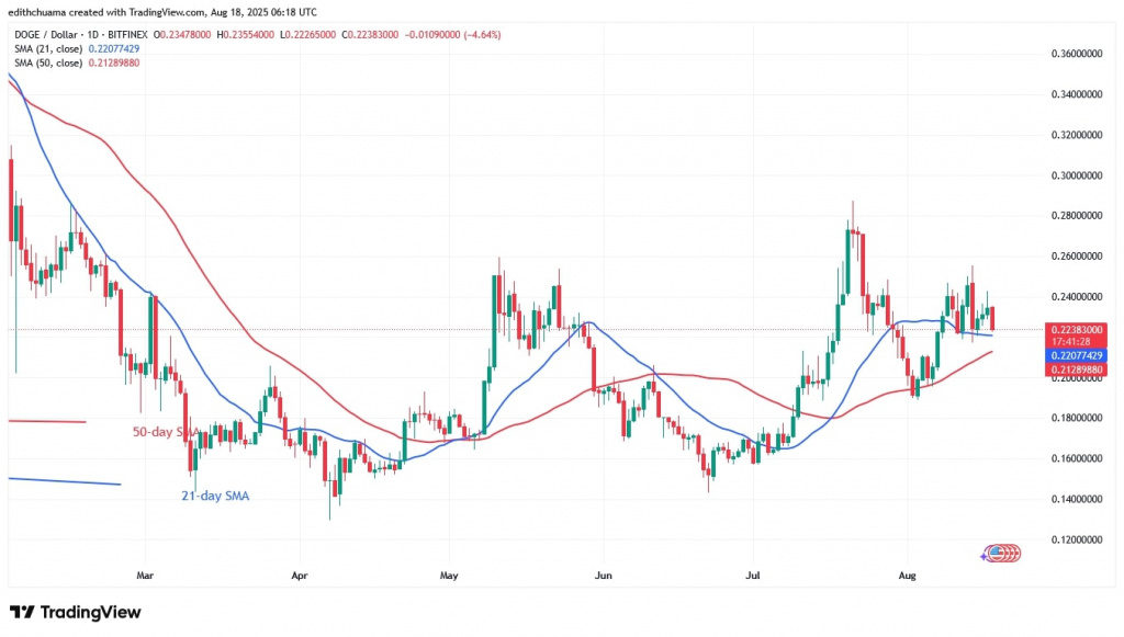 The price of Dogecoin (DOGE) has been trading above the 21-day SMA support and below the $0.25 resistance since August 8.