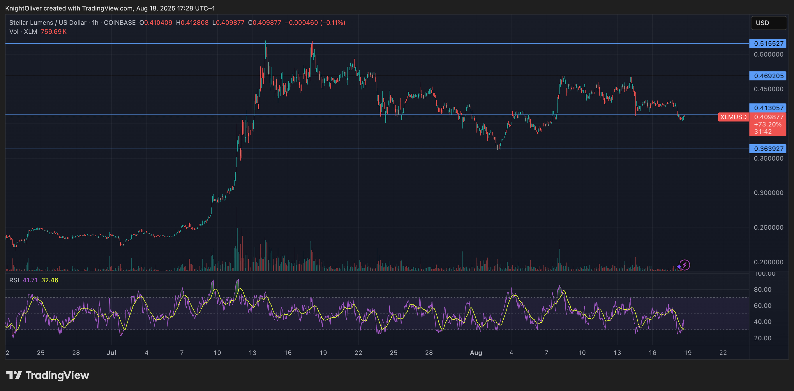 The most notable liquidation event occurred between 1:00 AM and 3:00 AM on August 18, when institutional sellers offloaded more than 60 million tokens. This selloff forced XLM down from $0.42 to $0.41, creating strong resistance at the $0.42 level and defining new support near $0.41.