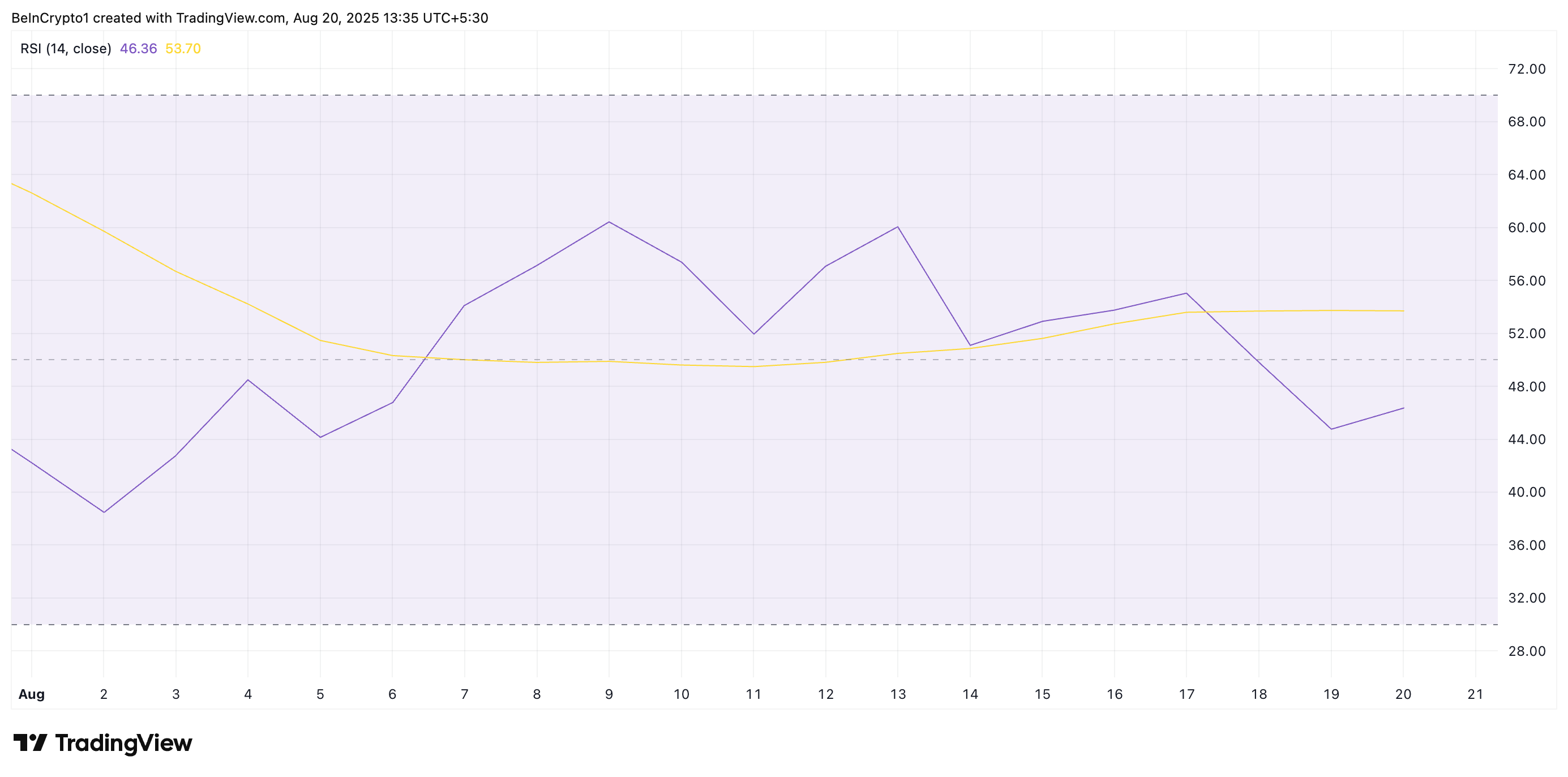 As of this writing, DOGE’s Relative Strength Index (RSI) struggles below the 50-neutral line, supporting this bearish outlook. It is at 46.36, reflecting the waning buy-side activity among market participants.