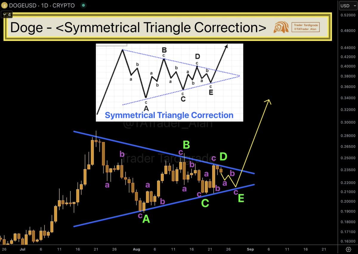 - Dogecoin forms a triangle pattern, with analysts closely watching the $0.25 resistance and $0.22 support levels.