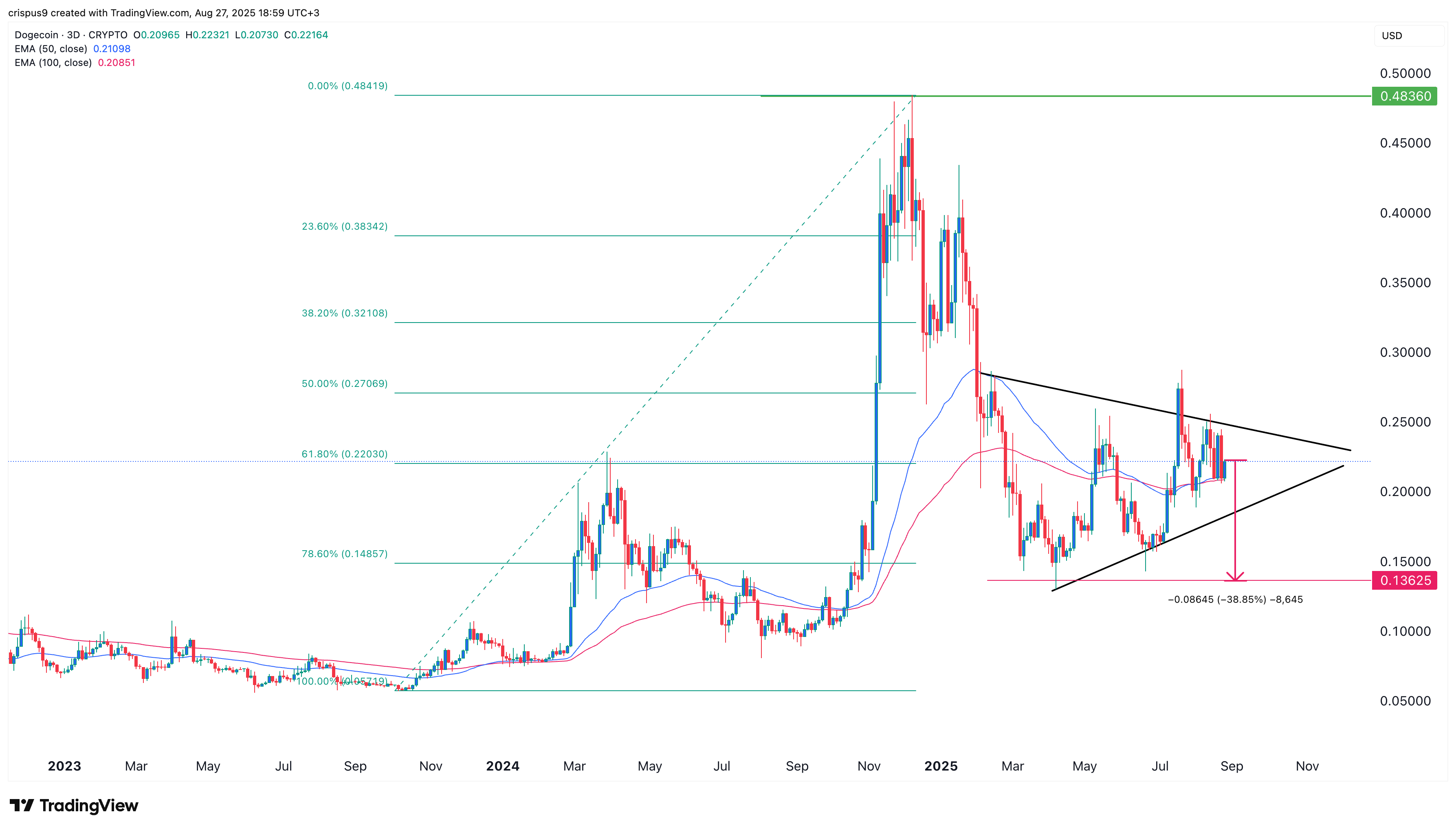 Dogecoin price is slowly forming a symmetrical triangle whose two lines are about to converge. The lower line connects the lowest swings since April, while the upper trendline links the highest level in February and August.