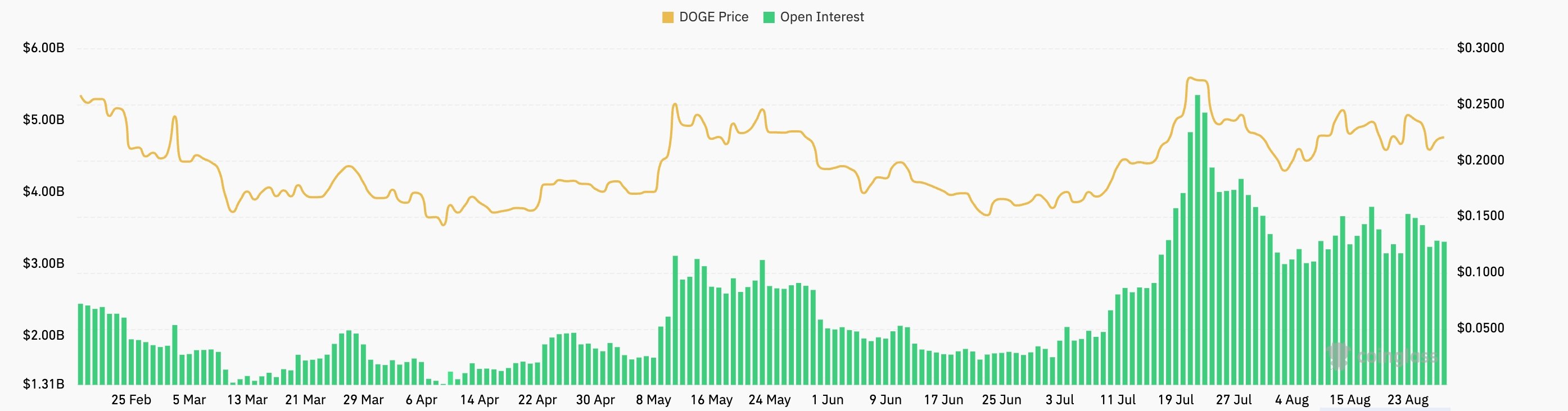 CoinGlass data shows that DOGE’s futures open interest has been dwindling since July. It recently peaked at $5.3 billion on July 22 and has now fallen by almost 40%.