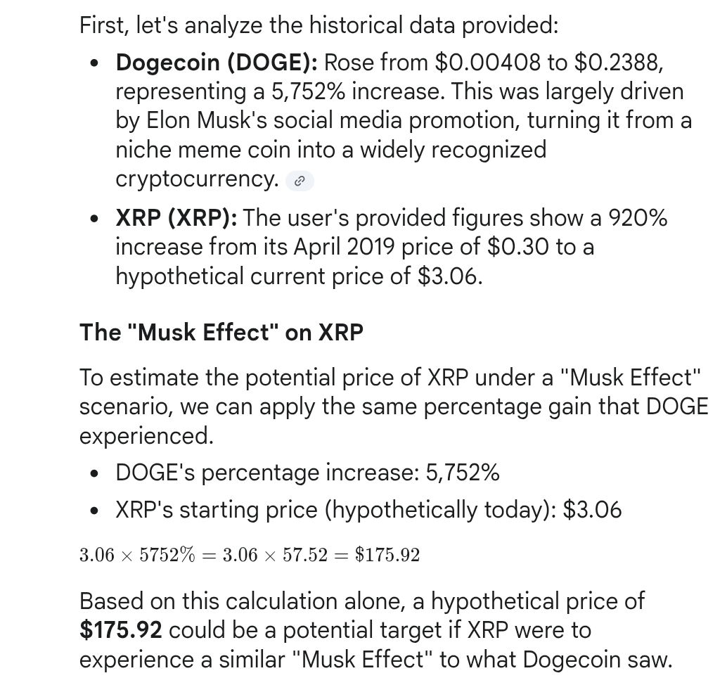 As a result, we posed the question to Google Gemini. According to the chatbot, if Musk started promoting XRP today at its current price of $3.00 and the coin experienced the same percentage gain that Dogecoin did, XRP could climb as high as $175.92.