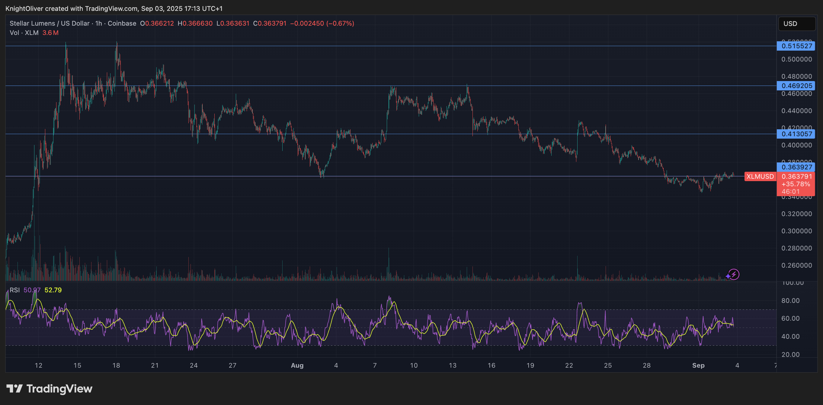 XLM traded in a narrow band between $0.36 and $0.37 in the 24 hours leading up to the upgrade, with volume spikes coinciding with tests of resistance at the upper end of that range.