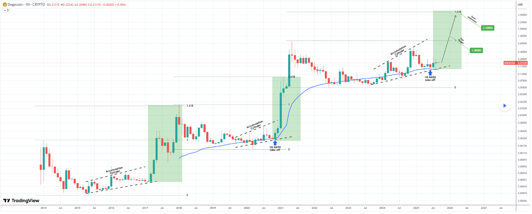 Previous cycles have followed a similar path where, once the MA50 take-off was established, DOGE entered a parabolic rally phase, each time reaching at least the 1.618 Fibonacci extension from its previous all-time high.