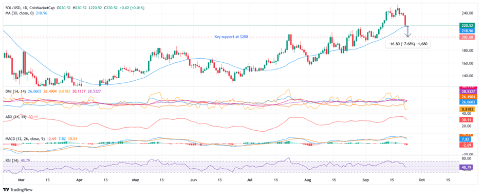 The chart setup for Solana adds to the caution. Price action has struggled to hold above the $220 level, breaking below its 30-day moving average and facing repeated rejections near $240.