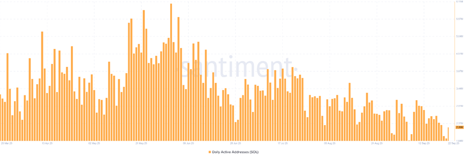 Daily active addresses on Solana have fallen by nearly 27% in just a week, slipping from 2.6 million to 1.9 million.