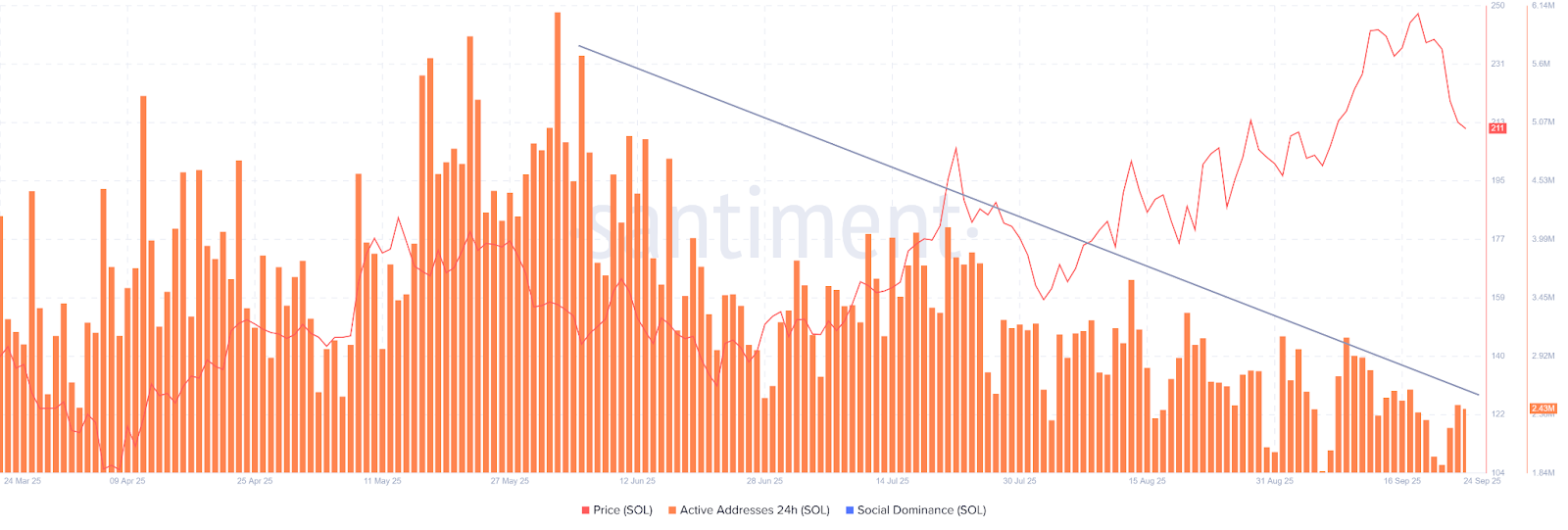 This can be seen in the whale’s behaviour. SOL worth $17.45M was moved to exchanges like Kraken and Binance on September 8. Also, on Sept 21, there were whale outflows of $836 million in SOL from exchanges. This trend has been linked to corrections in the past, like the 12% drop in July 2025.