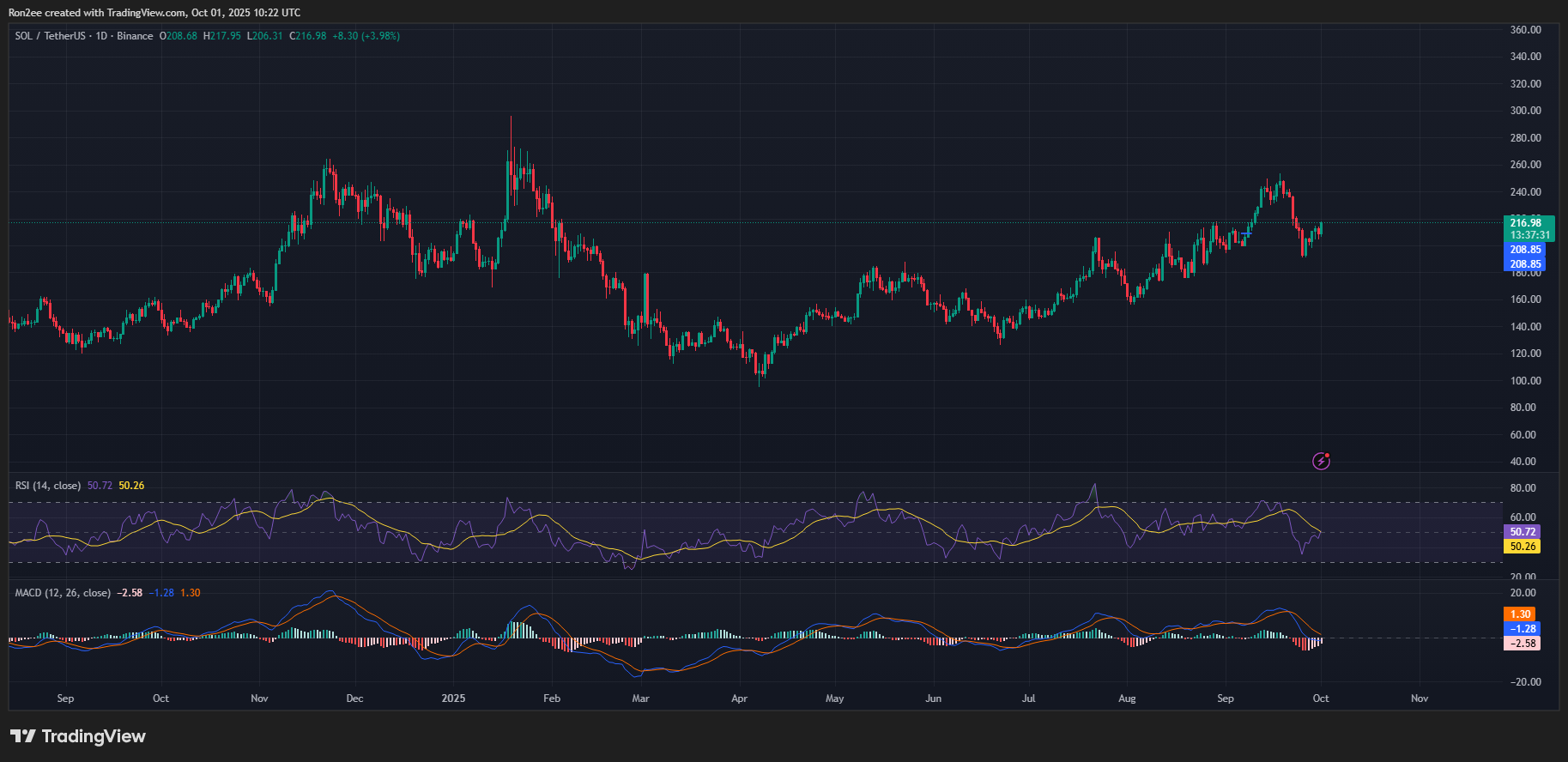 According to data from crypto.news, Solana (SOL) was trading at $212.39 at press time, up 10.6% from its September low and over 100% from its year-to-date low.