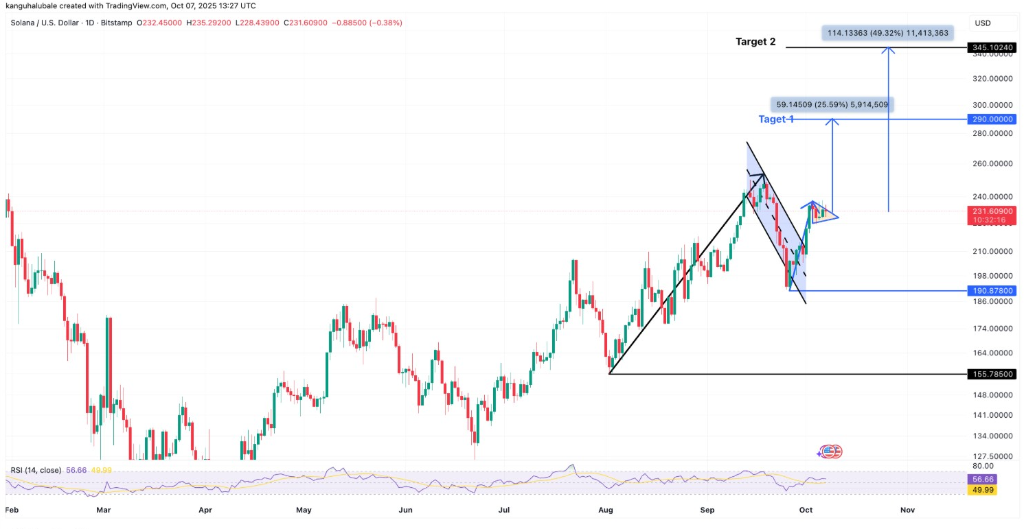 On-chain sentiment is on the positive side. The ecosystem activity of Solana has accelerated, and developer activity and decentralized exchange volumes are growing. Technical indicators are in favor of SOL price continuation. The daily chart shows two bull flag formations, which show possible targets between $290 and $345 after breakage of resistance points of $233 and $260. In case ETFs are accepted, institutional inflows would push the token towards $300.
