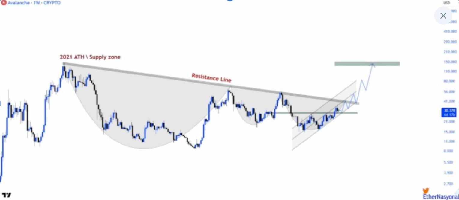 EtherNasyon highlighted a long-term bullish structure forming on the weekly chart. Avalanche is pressing against a multi-year resistance trendline dating back to its 2021 highs. If this barrier is broken, the setup resembles a massive cup-and-handle formation that could propel AVAX toward $100–$150 in the coming months. Rising trading volumes and institutional participation further validate this bullish outlook.