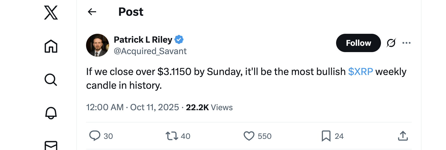XRP is bouncing back after one of the sharpest drops in months. The coin fell to $1.25 before recovering to nearly $2.40, showing renewed strength. Analyst Patrick L. Riley said that if XRP closes the week at $3.115, it would mark its most bullish weekly close ever.