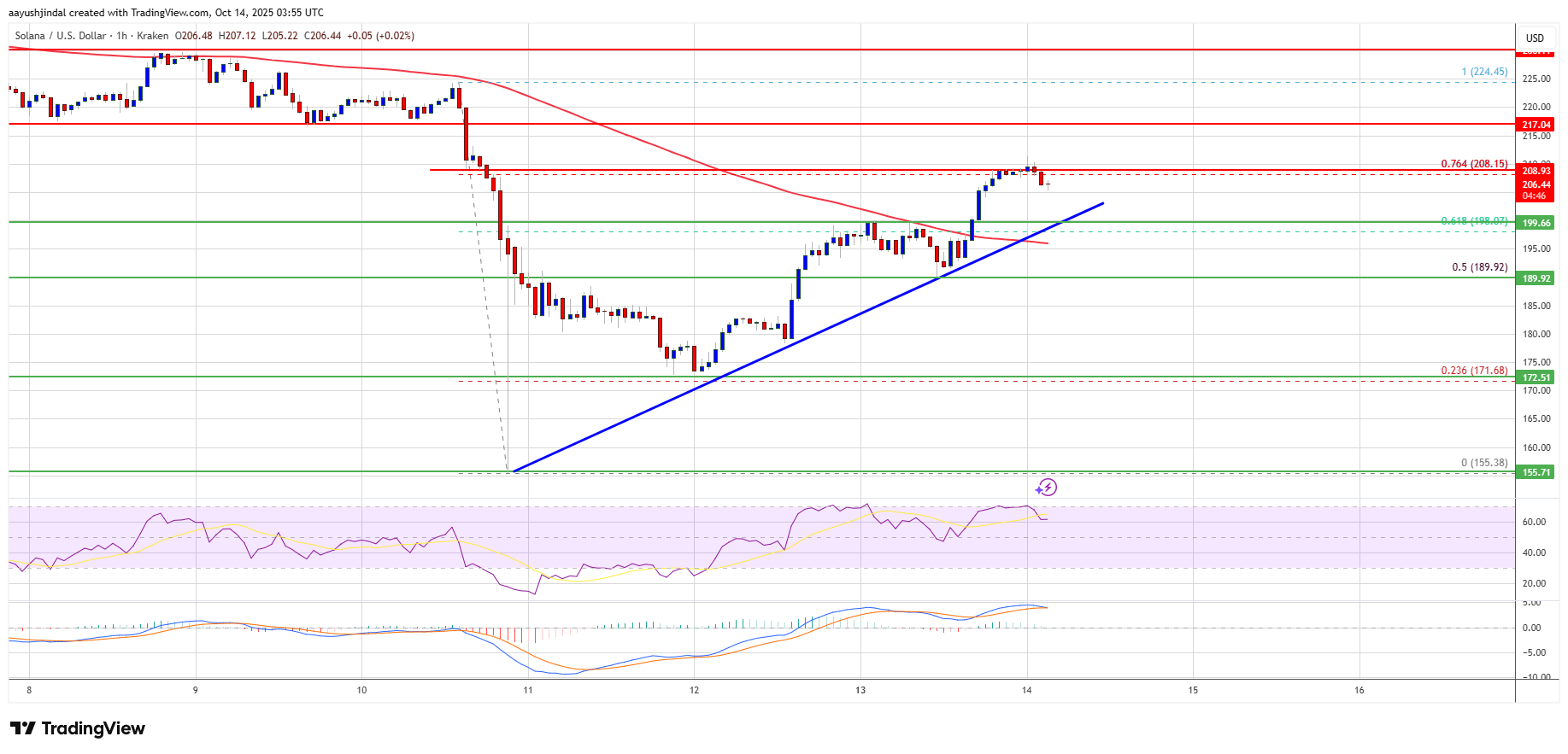 Solana is now trading above $202 and the 100-hourly simple moving average. On the upside, the price is facing resistance near the $208 level and the 76.4% Fib retracement level of the main drop from the $225 swing high to the $155 low. The next major resistance is near the $218 level.