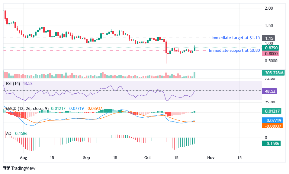 A decisive close above that could open the path toward $1.15, with further upside targets near $1.36 and $1.90, former resistance zones that once defined the token’s mid-year highs.