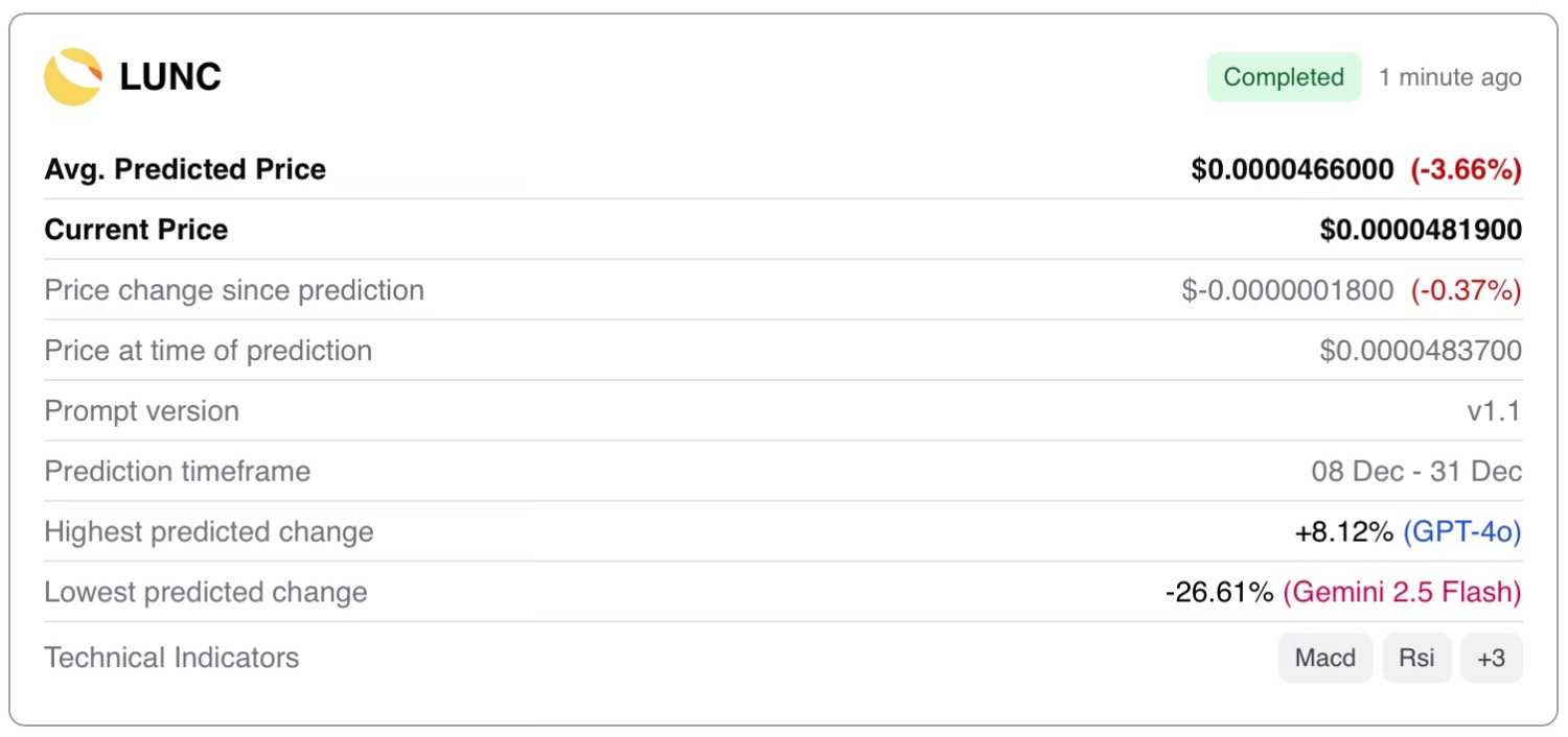 Namely, Finbold’s AI prediction agent employed three leading large language models (LLMs) to project a LUNC price by December 31, with the average forecast coming in at $0.00004660. Compared with the current price of $0.00004819 on December 8, the figure implies a 3.66% downside.
