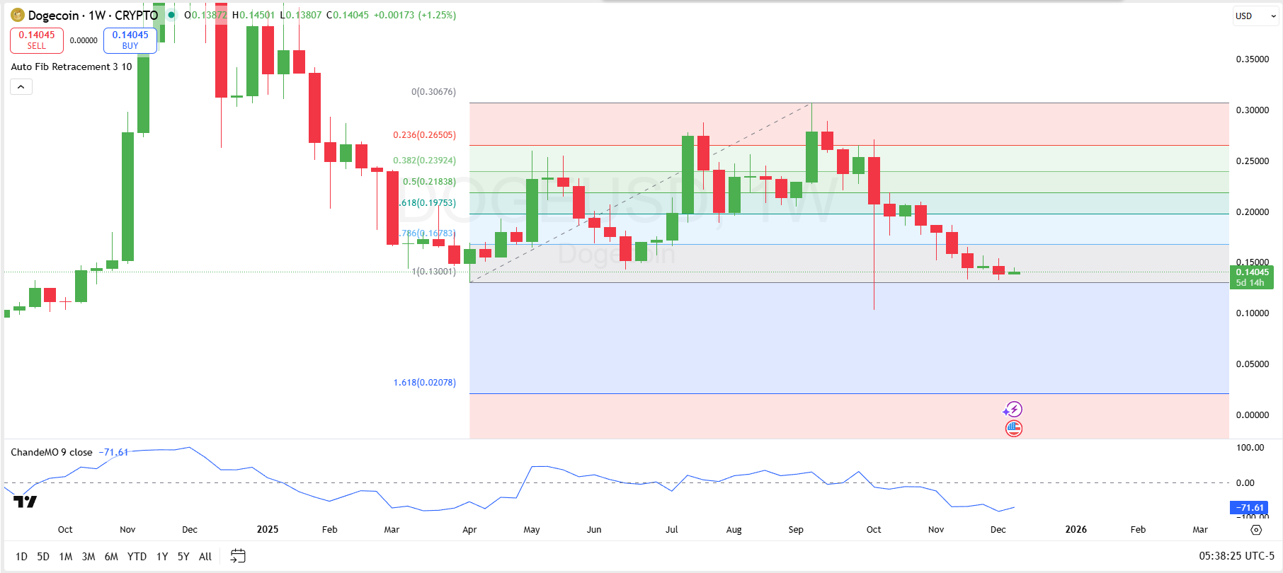 Notably, the Dogecoin weekly chart reveals a downward price trend, with key Fibonacci retracement levels acting as significant support and resistance zones.