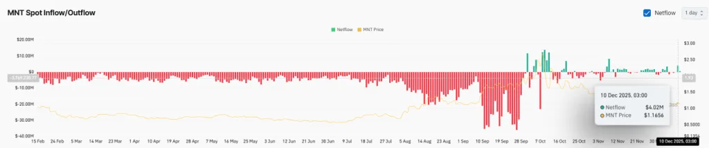 Exchange flow data reinforces the idea that traders have moved into a profit-taking phase. On Dec. 10, Mantle posted $4.02 million in net inflows at roughly $1.1656. Although inflows might appear constructive at first glance, they typically mean something else entirely: tokens are being moved onto exchanges, usually because traders expect to sell or reduce exposure.