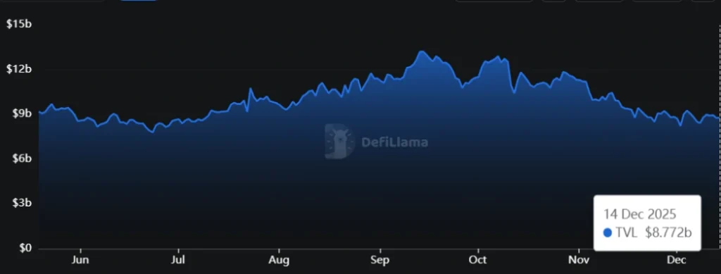 - SOL’s DeFi total value locked remains largely unchanged, hovering around the $8.7–$8.8 billion range.