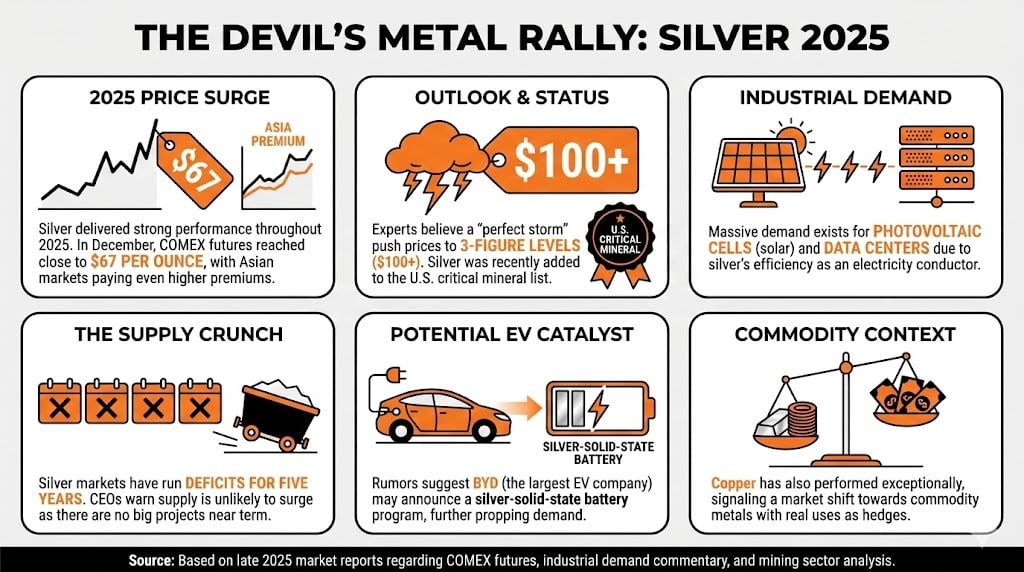 Silver’s critical role in producing photovoltaic cells and its rumored application in new solid-state batteries highlight its growing industrial significance.