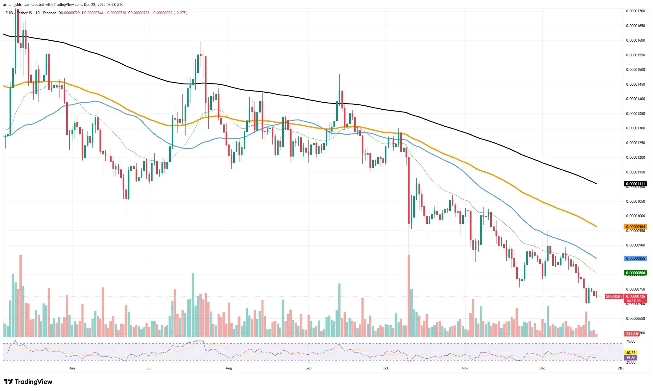 Shiba Inu continues to struggle within a persistent downtrend. The market structure shows no indication of a bullish shift. SHIB trades below all major moving averages, signaling ongoing weakness in price action.