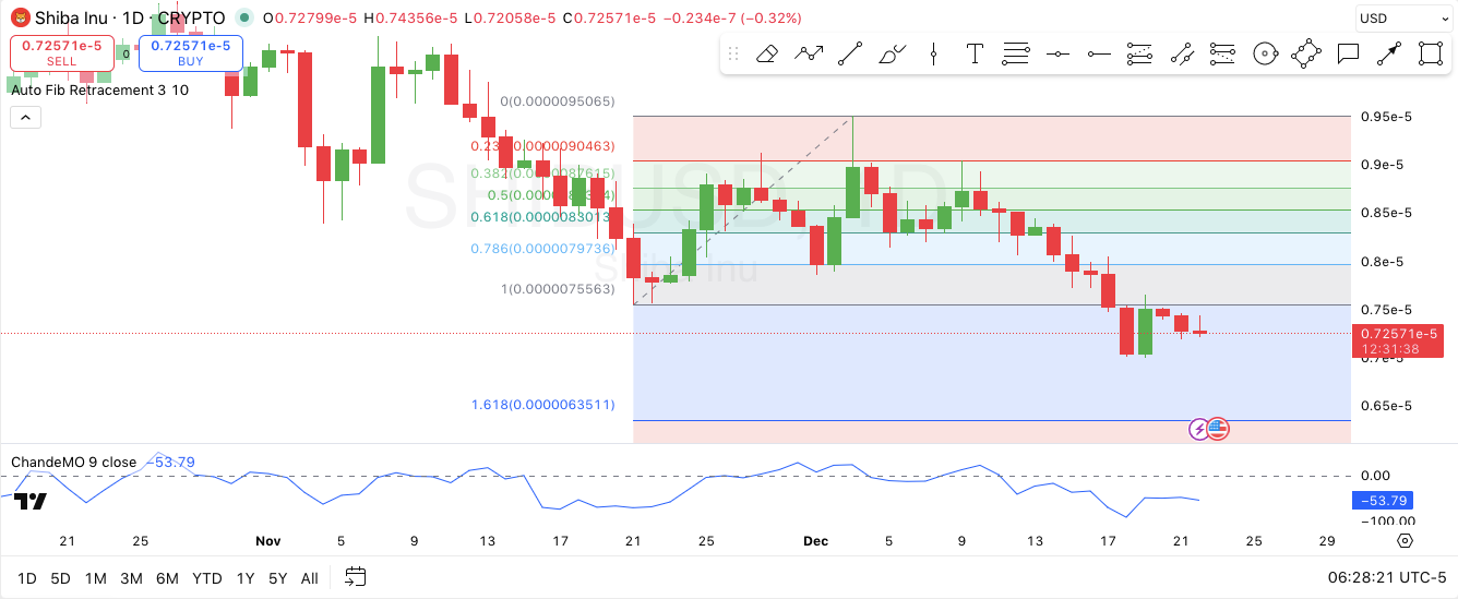 A chart from TradingView shows Shiba Inu with key Fibonacci retracement levels, indicating possible support and resistance areas. Currently, the Fibonacci retracement levels suggest key support at 1.618 ($0.00000635) and next potential resistance at 1 level ($0.00000756).