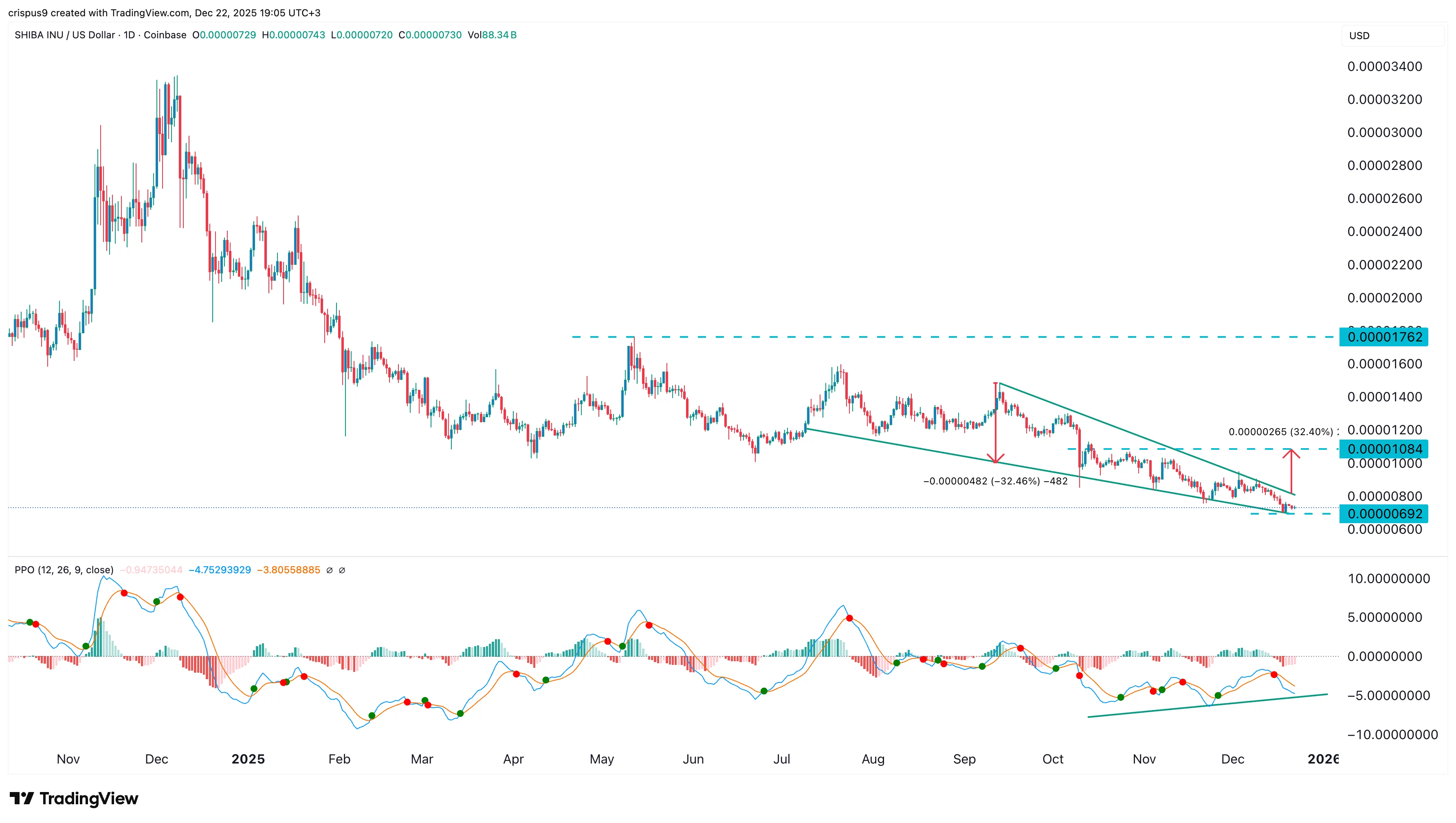 The Shiba Inu Coin price was flat on Monday, Dec. 22, and hovered near its lowest level since October 2023.