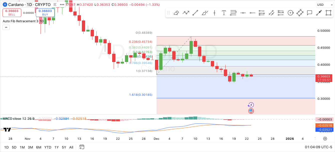 If Cardano can break above the $0.3714 resistance, it may signal a reversal towards the upper Fibonacci levels, particularly near the 0.786 retracement level at $0.3955. However, until ADA breaks above these resistance levels, the market sentiment remains predominantly bearish.