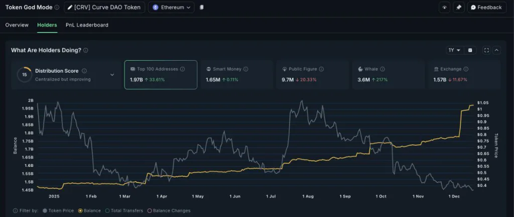 Whale activity tells its own story. On-chain data shows the top 100 wallets added roughly 8% of CRV’s circulating supply since September, while exchange balances fell about 23%, based on Nansen figures shared on X.