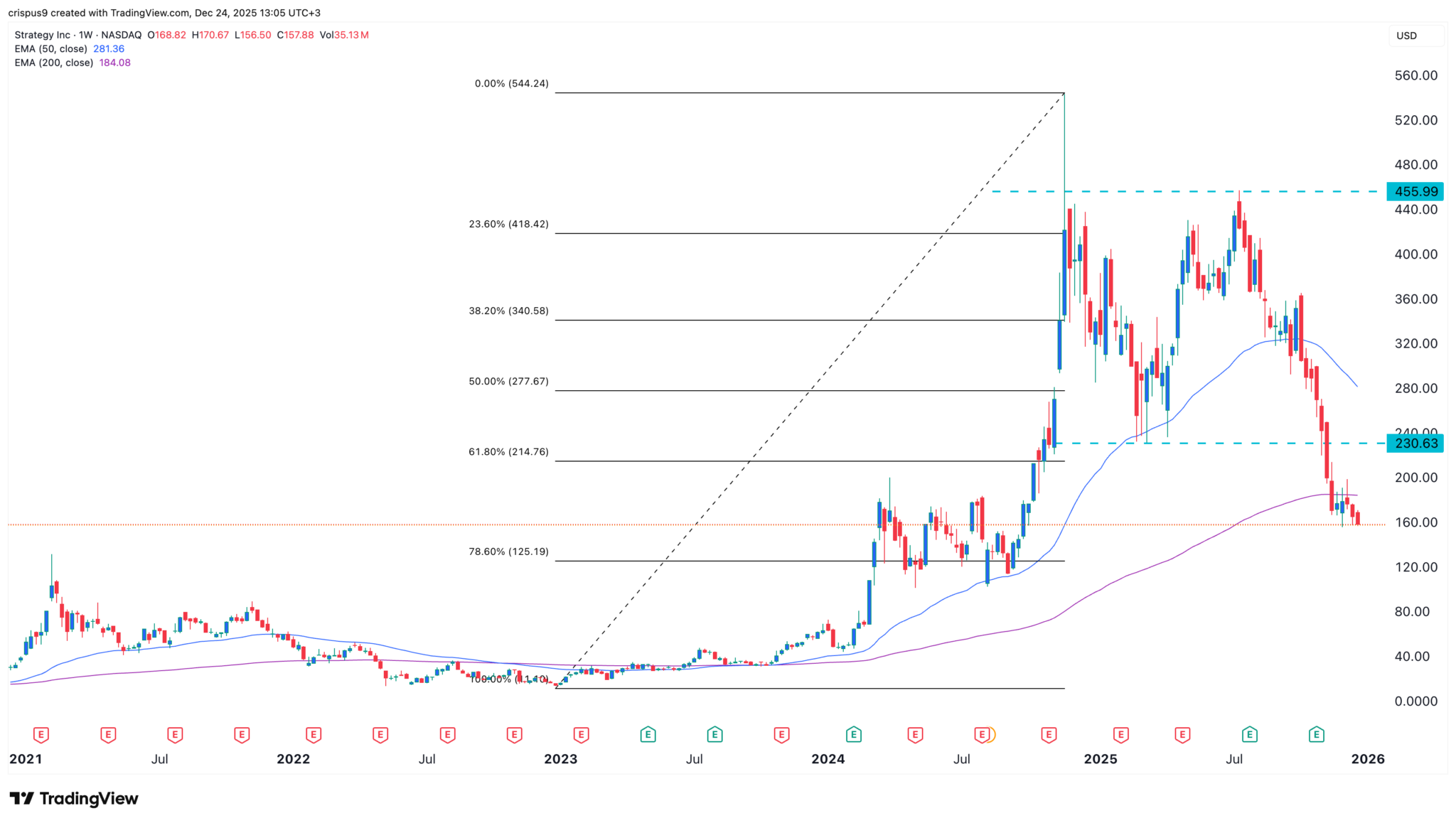 The daily timeframe chart shows that the Strategy’s share price has been in a strong bearish trend in the past few months. It has tumbled from a high of $455 in July to $157 today. The stock has already plunged below the 200-day and 50-day moving averages.
