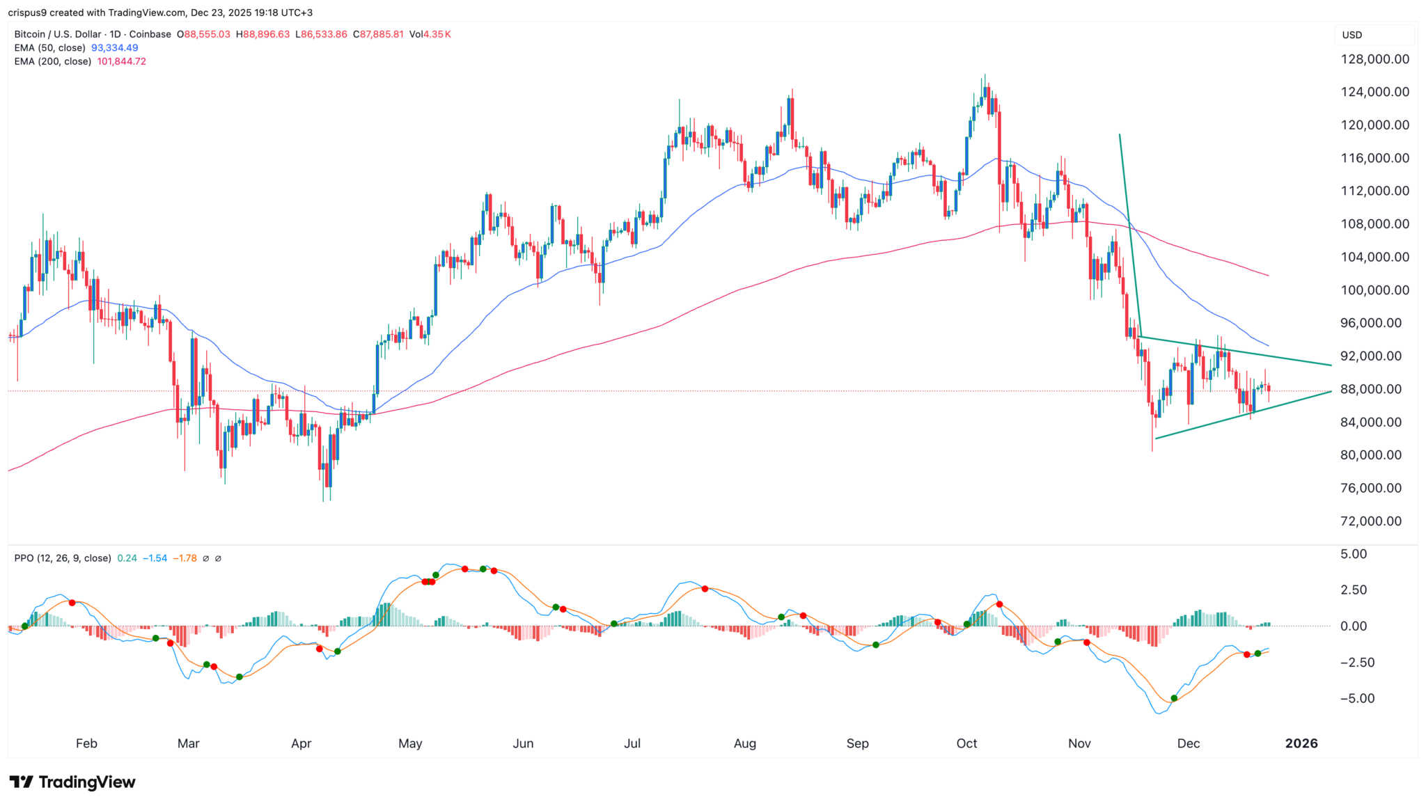 The daily chart shows that the BTC price has crashed from a high of $126,200 in October to the current $86,787. It has aready formed a death cross pattern as the 50-day and 200-day moving averages crossed each other.