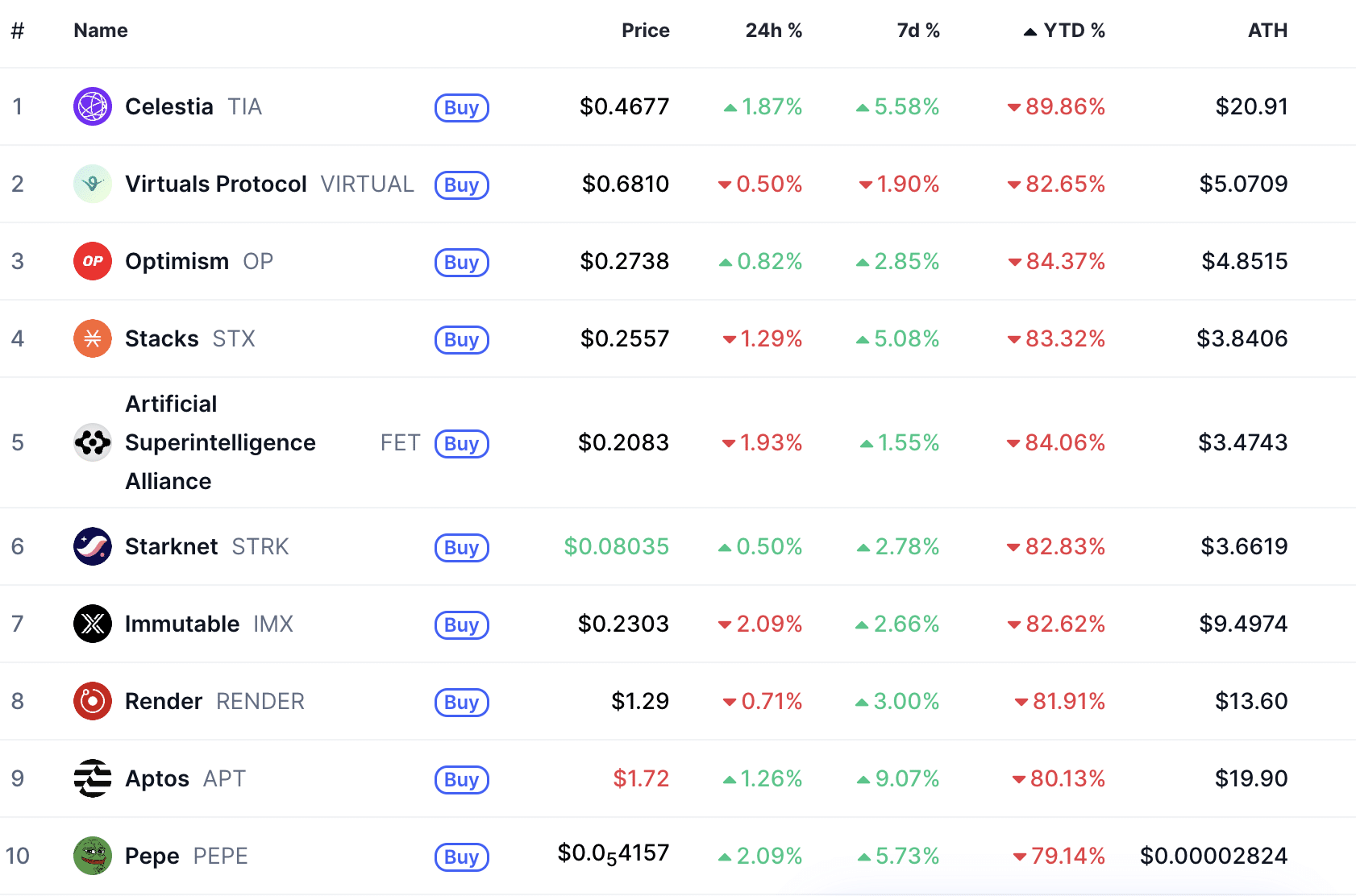 TIA $0.46 24h volatility: 0.1% Market cap: $396.47 M Vol. 24h: $31.27 M , a proof-of-stake L1 blockchain optimized for app creation, lost almost 90% year-to-date. According to CMC, it fell from about $5.5 at the start of 2025 to $0.46 near year-end.