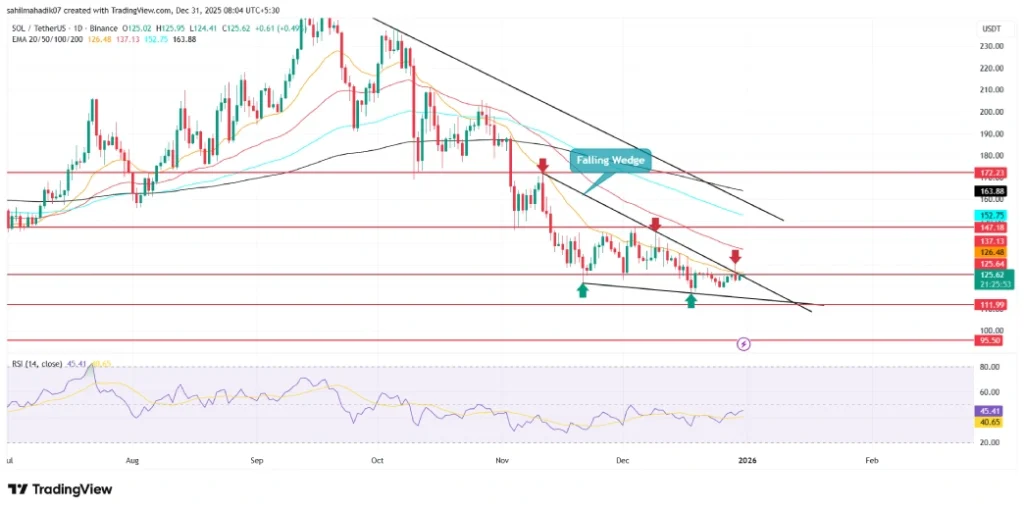 - Since early November, the Solana price has been resonating within the formation of falling wedge patterns.