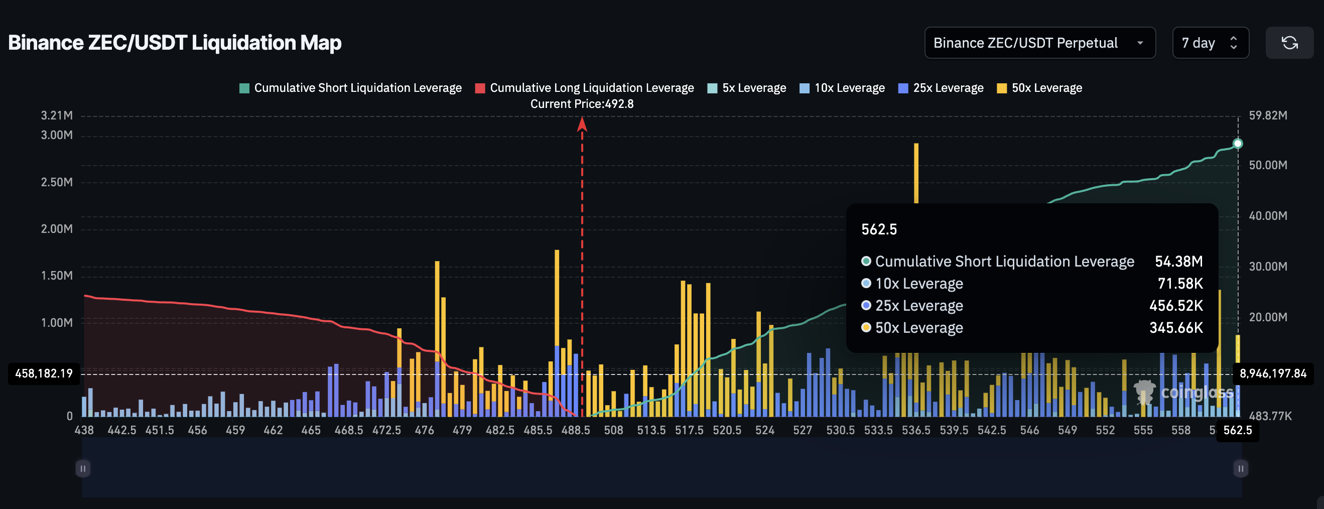 On the 7-day Binance ZEC/USDT liquidation map, short liquidation leverage stands near $54.38 million, while long liquidation leverage sits around $24.41 million. That puts short exposure more than 120% higher than longs in the near term, increasing the risk of volatility and pullbacks. The 7-day view, therefore, leans bearish.