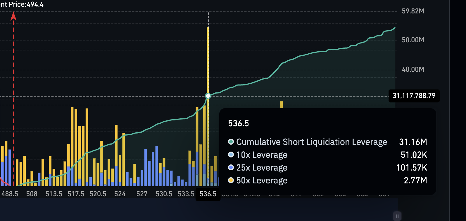 From a structural perspective, confirmation is still missing. A move above $519 would signal a clean break from consolidation. Clearing $541 could trigger heavy short liquidations, accelerating upside momentum.