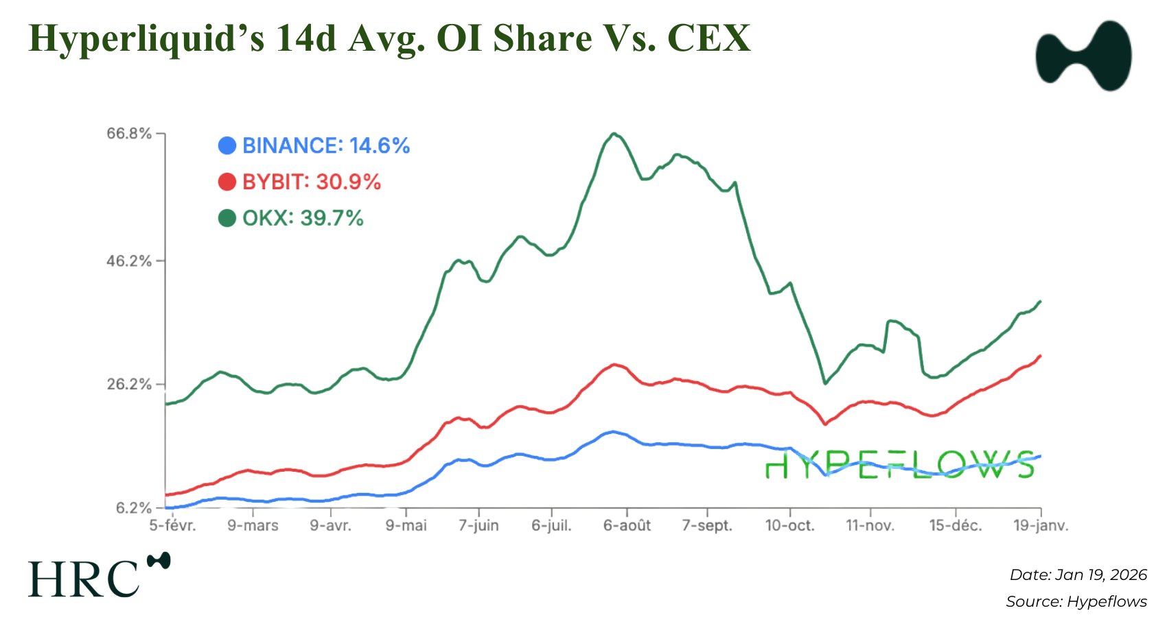Moreover, Hyperliquid is regaining market share from centralized exchanges (CEXs) as seen in the chart below, with its open interest currently representing about 14.6% of Binance’s, gaining momentum against platforms like Bybit and OKX.
